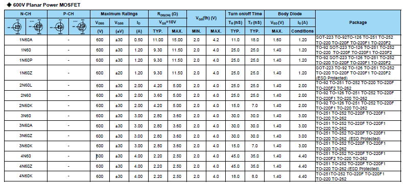 4N60L:4A, 600V/650V N-CHANNEL POWER MOSFET 4N60L規(guī)格書下載: